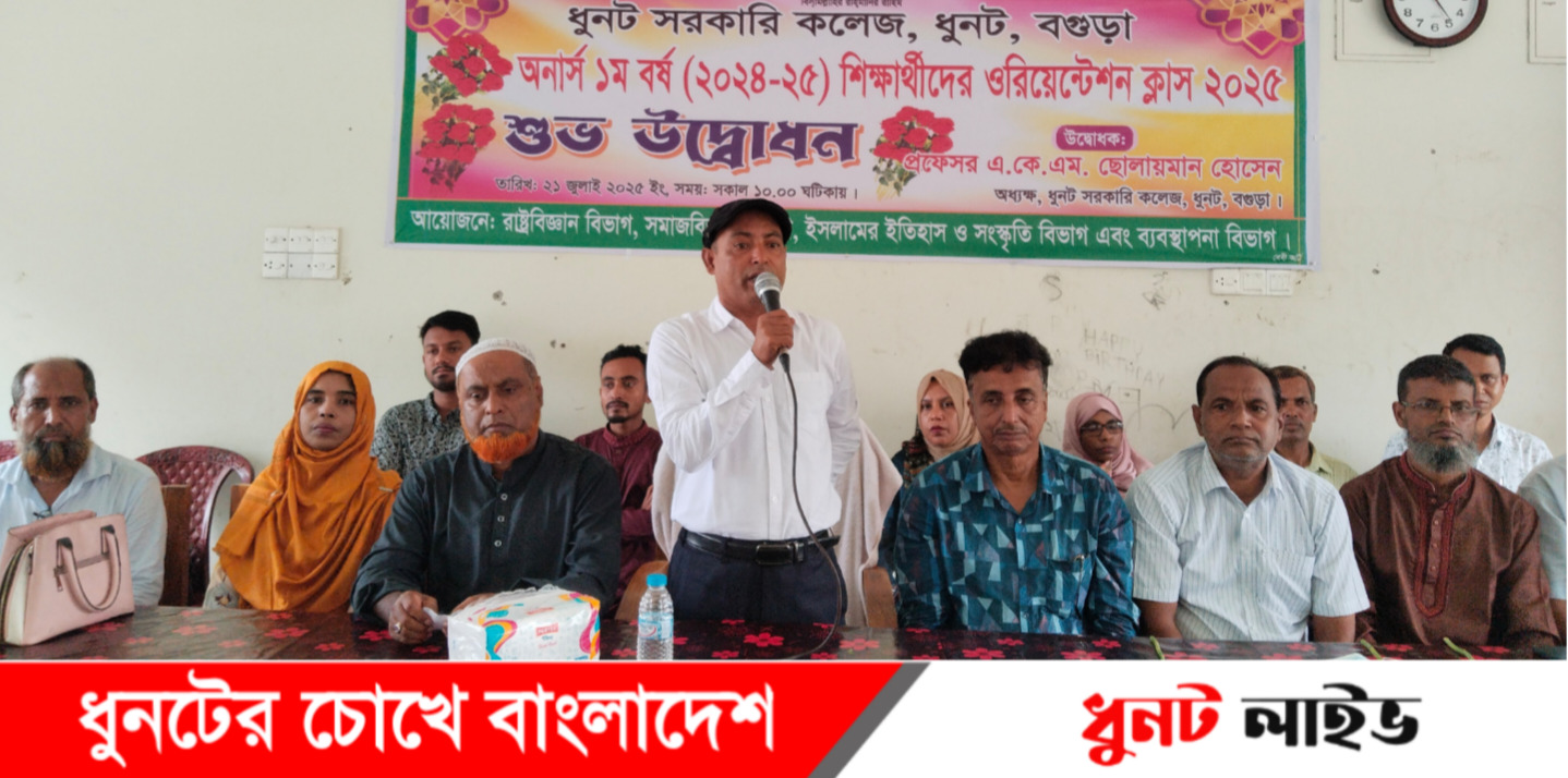 বগুড়ার ধুনট সরকারি কলেজে অনার্স প্রথম বর্ষের নবীন শিক্ষার্থীদের ওরিয়েন্টেশন ক্লাসের উদ্বোধন ও ফুল দিয়ে বরণ করা হয়েছে। ধুনট সরকারি কলেজের অনার্স বিভাগের আয়োজনে এ ওরিয়েন্টেশন ক্লাস অনুষ্ঠিত হয়।