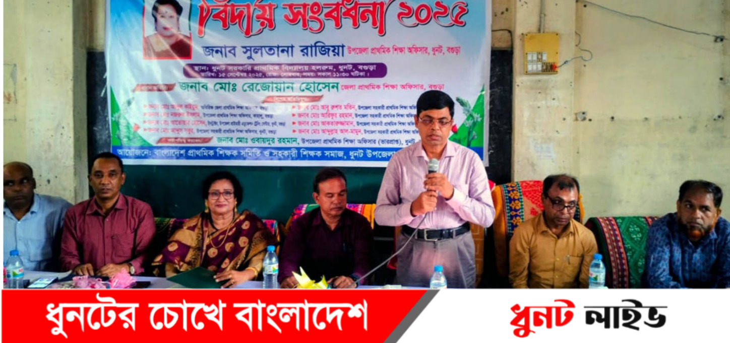 সোমবার সকাল ১১টায় ধুনট সদর সরকারি প্রাথমিক বিদ্যালয় হলরুমে বিদায় সংবর্ধনা অনুষ্ঠানে প্রধান অতিথির বক্তব্য রাখেন জেলা শিক্ষা কর্মকর্তা রেজোয়ান হোসেন। বিশেষ অতিথির বক্তব্য রাখেন অতিরিক্ত জেলা শিক্ষা কর্মকর্তা আব্দুল কাইয়ুম।