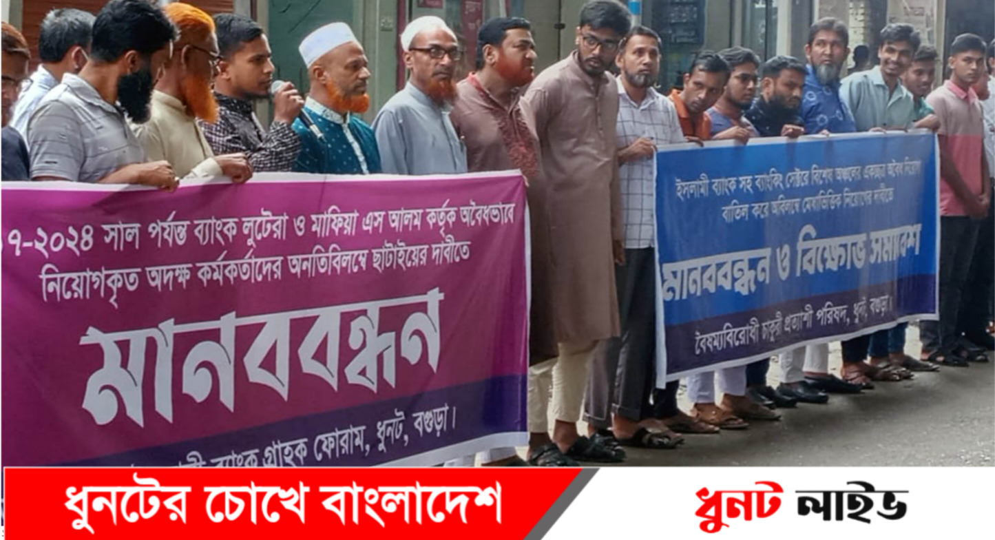 ইসলামী ব্যাংক বাংলাদেশ লিমিটেডে এস আলম গ্রুপের ছত্রছায়ায় নিয়োগপ্রাপ্ত অদক্ষ কর্মকর্তাদের ছাঁটাইয়ের দাবিতে বগুড়ার ধুনট উপজেলায় মানববন্ধন কর্মসূচি পালিত হয়েছে। সোমবার সকাল ৯টায় ইসলামী ব্যাংক ধুনট শাখা কার্যালয়ের সামনের রাস্তায় গ্রাহক ফোরামের আয়োজনে এ কর্মসূচি অনুষ্ঠিত হয়।