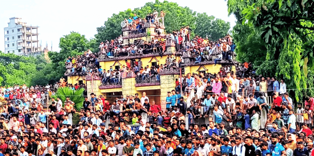 ফাইনাল ম্যাচ ঘিরে সকাল থেকেই দর্শকদের ঢল নামে স্টেডিয়াম ও আশপাশের এলাকায়। কেউ গাছে, কেউ বিল্ডিংয়ের ছাদে উঠে খেলা উপভোগ করেন।