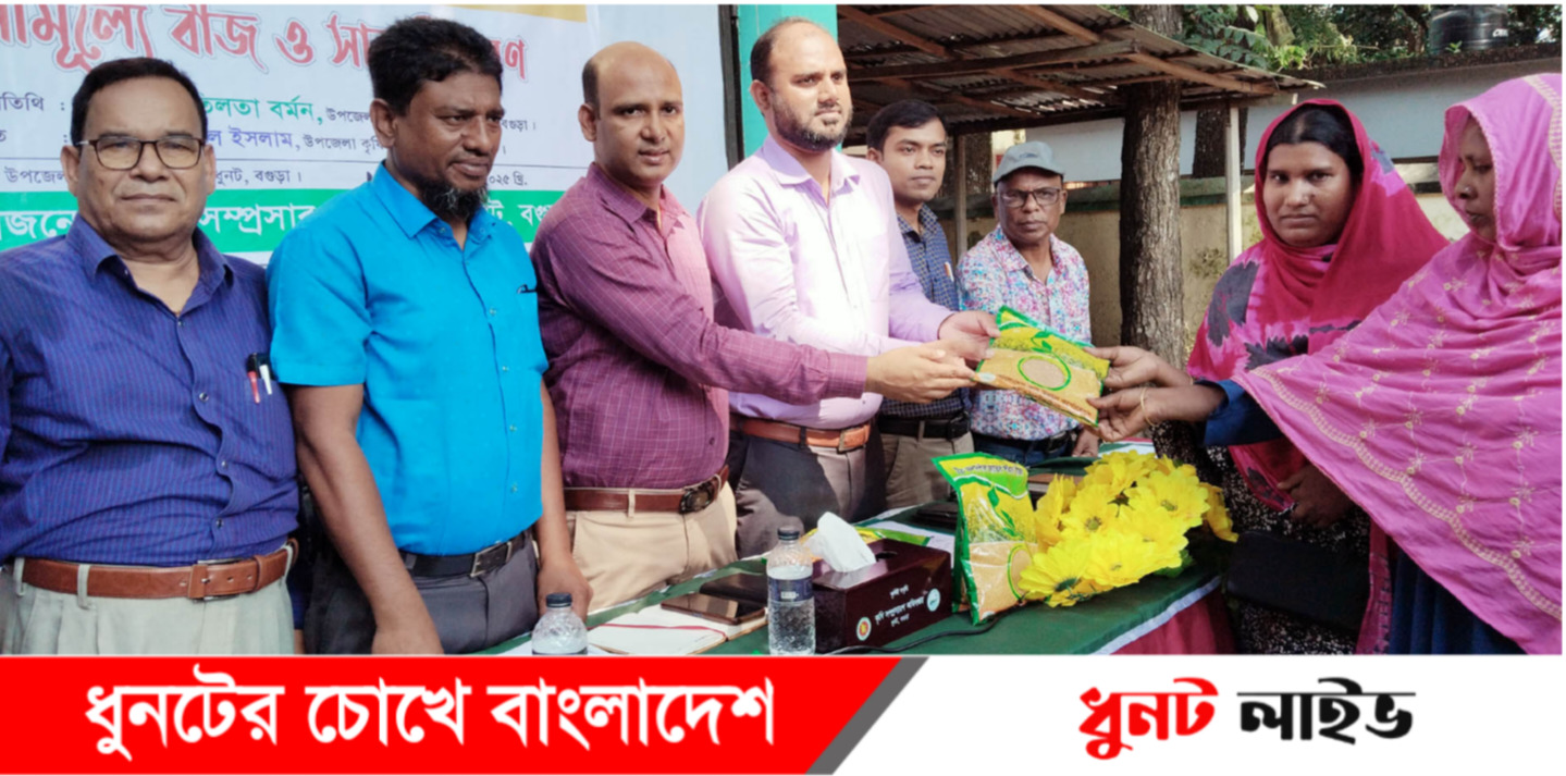 বগুড়ার ধুনট উপজেলা কৃষি সম্প্রসারণ অধিদপ্তরের আয়োজনে ক্ষুদ্র ও প্রান্তিক ৩ হাজার ২ শত ৩০ জন কৃষক-কৃষাণীর মাঝে বিনামূল্যে বীজ ও সার বিতরণ করা হয়েছে। মঙ্গলবার সকাল ১০টায় ধুনট উপজেলা কৃষি অফিস চত্বরে বীজ ও সার বিতরণ উপলক্ষে এক আলোচনা সভা অনুষ্ঠিত হয়।