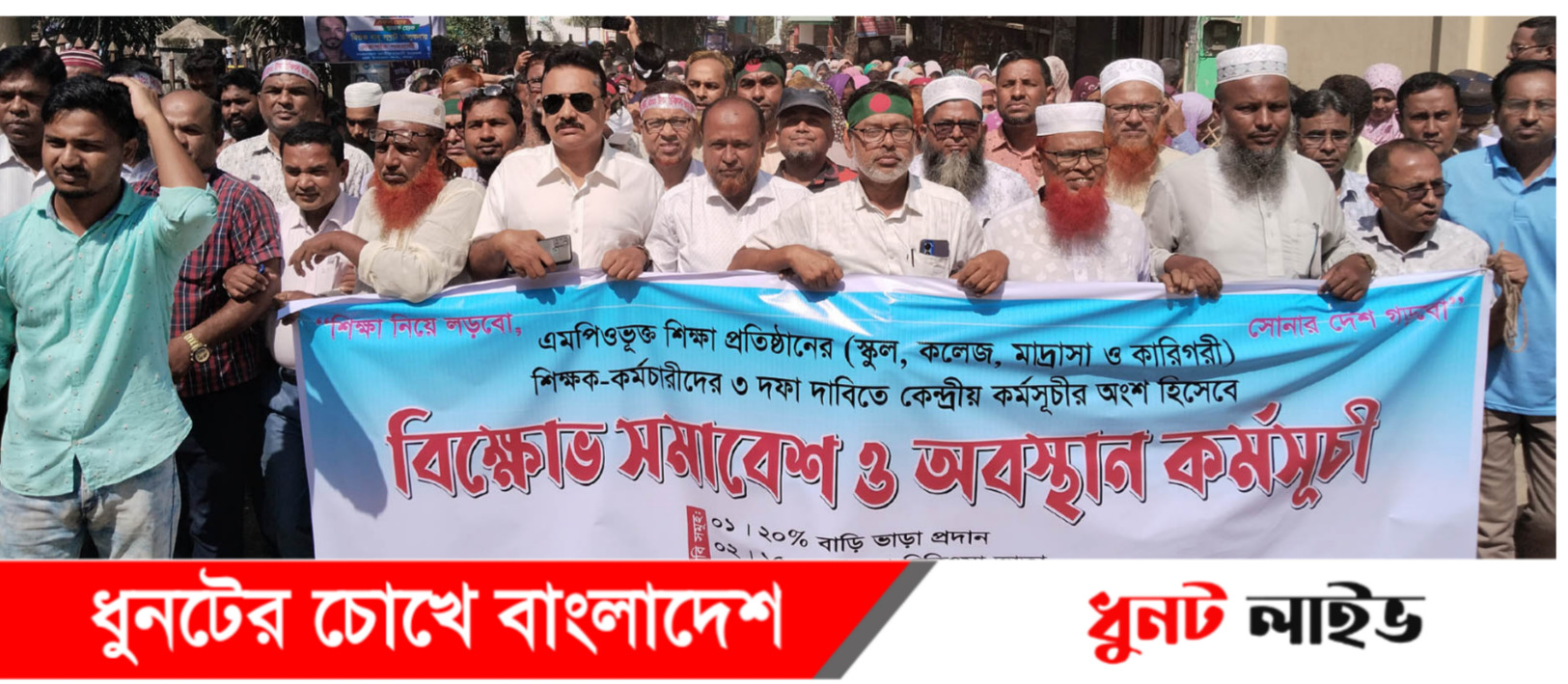 শিক্ষা জাতীয়করণ প্রত্যাশী জোট, ধুনট উপজেলা শাখার আয়োজনে এ বিক্ষোভ সমাবেশ ও অবস্থান কর্মসূচি অনুষ্ঠিত হয়। তিন দফা দাবি হলো—শিক্ষকদের বাড়িভাড়া ভাতা ও চিকিৎসা ভাতা প্রদান এবং কর্মচারীদের উৎসব ভাতা নিশ্চিতকরণ।