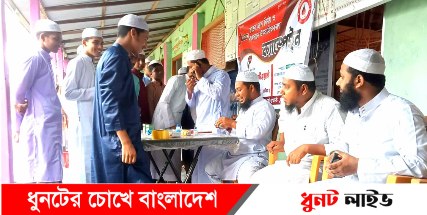 বগুড়ার ধুনট উপজেলার শ্যামবাড়ী দারুল হুদা কওমী হাফিজিয়া মাদ্রাসায় আল ইহসান ব্লাড নেটওয়ার্কের আয়োজনে বিনামূল্যে রক্তের গ্রুপ নির্ণয় ও রক্তদানে